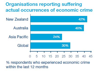 “(The) survey shows that economic crime continues to be a serious issue affecting New Zealand organisations with the current economic crisis increasing the pressures and incentives to commit fraud. New Zealand had the eighth highest reported level of fraud across the 54 countries that took part, with 42% of our respondents saying that they suffered from some form of economic crime in the last 12 months. The average cost of fraud in New Zealand was $491,506 with one organisation reporting that economic crime cost them in excess of $7 million in the last 12 months.