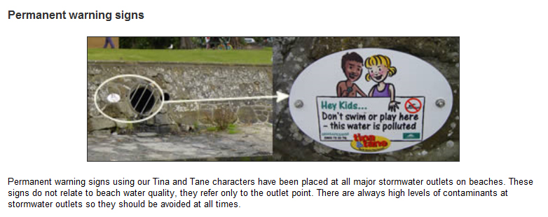 Great, but do the tourists know that, what if they just read newspaper articles that tell them “all Auckland and North Shore beaches were safe for swimming”? and if the water is safe for swimming why does the following also appear in the North Shore City Council’s website? (click to enlarge) and who is going to be looking for them anyway?