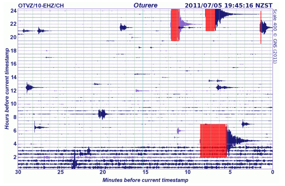 The quake has been followed by an almost continuous stream of vibrations, picked up on this drum from Oturere at Mount Ngauruhoe. Note the smaller quakes hours earlier. Charts like these are bound to raise concerns that the quake may be magmatic, or volcanic, in origin