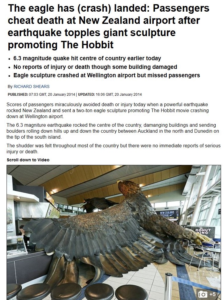 It was on display to promote the Hobbit films in the town which refers to itself as ‘Wellywood.’ The giant fantasy bird fell into an airport dining area when the first quake kicked off at 3.52pm, on one of the busiest days of the holiday season.