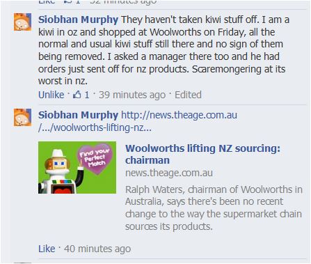This from Siobhan Murphy, a New Zealander living in New South Wales, Australia who says people supporting the page are scaremongering and NZ produce is still on sale in Australia: