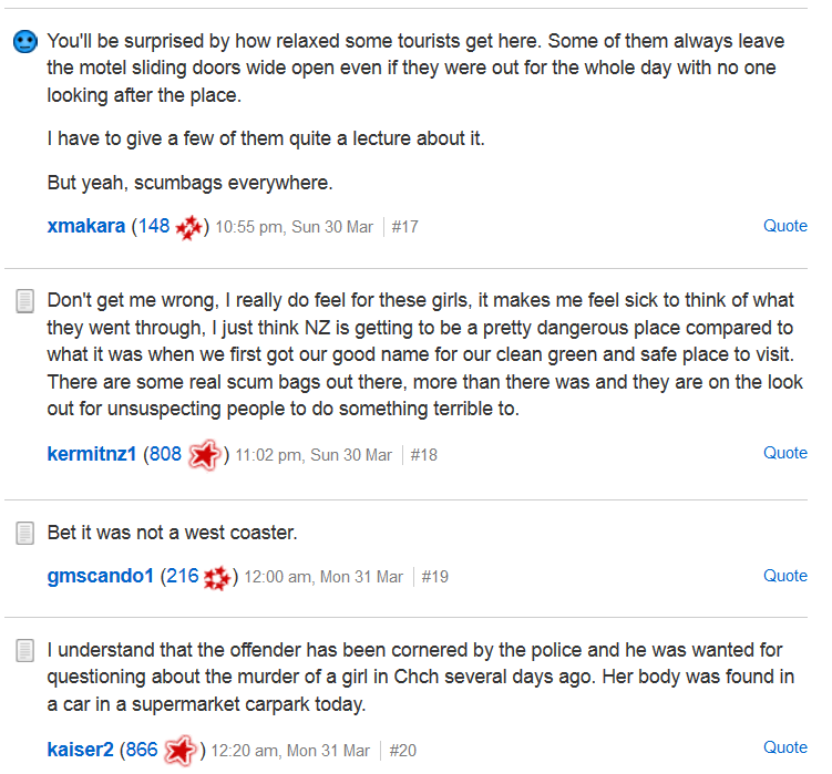 Yesterday afternoon two overseas tourists were attacked and left for dead at Franz Josef in Southland. Originally described as “two German women” (Hitchhikers left stabbed, with broken bones – Stuff) who’d accepted a lift near Whataroa, the women were later identified as a 28-year-old German woman and a 27-year-old woman of Japanese and Dutch origin. They suffered serious injuries in the attack, including stab wounds to the neck and a broken pelvis.