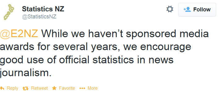 I do not know if many people are aware of this, but Statistics New Zealand awards cash prizes to media reporters every year. For “best” use of its statistics in a story. Consider too the publicity that comes of that “best use” for the reporters who win the prizes. This policy demonstrates, among other things, the incestuous relationship between the government and private interests which has been observed before on this site and on Expatexposed. The New Zealand media colludes. It helps boost New Zealand’s reputation and suppress real life problems there in a way that the media in other countries does not do. This unethical practice does a lot to mislead foreigners about the conditions in New Zealand.