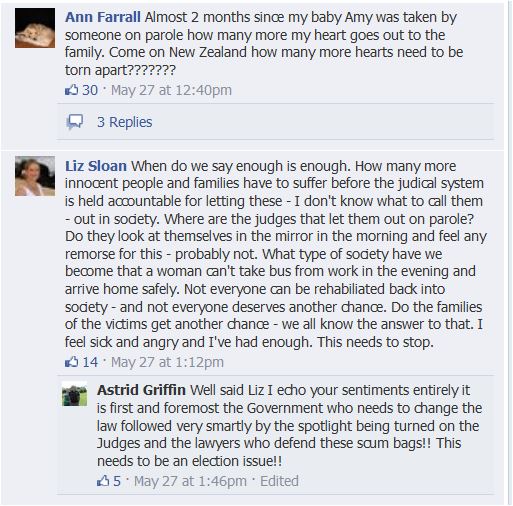 Update 9 June. A march protesting against NZ’s ineffective criminal justice system is planned for Wednesday 18 June. This is called a hui. When it is over New Zealanders will go back to their complacency until the next woman is killed/raped/tortured by a dangerous ex-con.