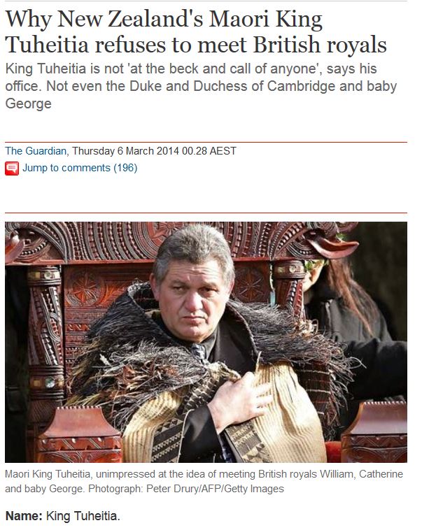 The Maori King has recently been in the NZ news after his reprobate 19 year old son Korotangi Paki was convicted of a number of criminal offences (one committed whilst out on bail) but escaped without punishment because having a record may affect his ability to be ‘king’ one day.