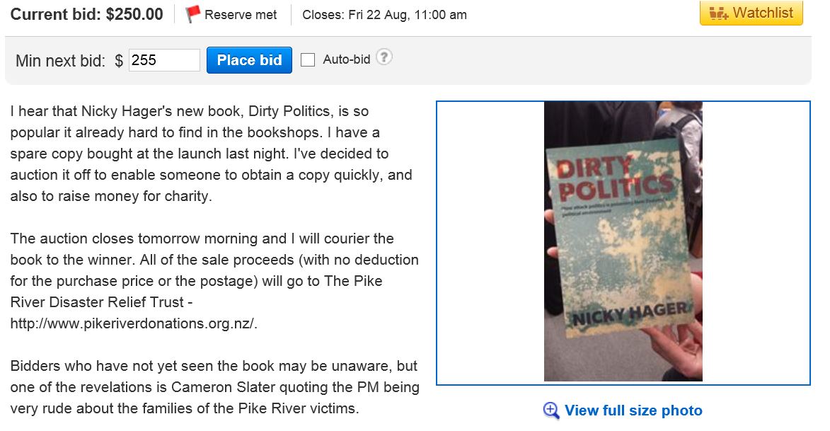 I hear that Nicky Hager’s new book, Dirty Politics, is so popular it already hard to find in the bookshops. I have a spare copy bought at the launch last night. I’ve decided to auction it off to enable someone to obtain a copy quickly, and also to raise money for charity.