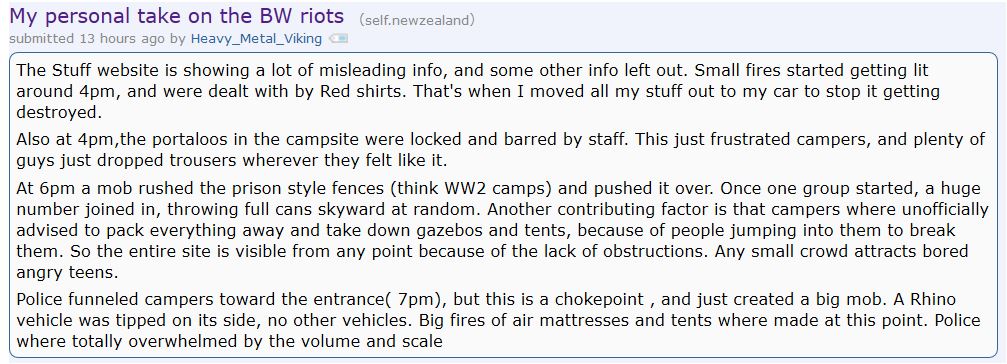 A concert go-er posted this comment on reddit/r/newzealand. He said the toilet portaloos were locked by staff at 4pm and fires were being lit around the site. Three hours later things got out of hand, culminating in police herding up campers around 7pm, creating an overwhelming mob they were ill equipped to deal with.