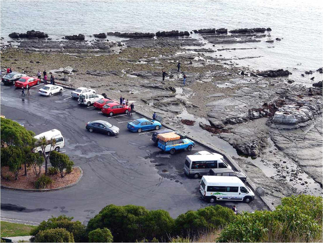 The seals are have long been known to bask on the car park’s tarmac (see picture above) and there are signs warning people to take care. The Kaikoura Peninsular Walkway brochure also advises visitors to look out for seals:
