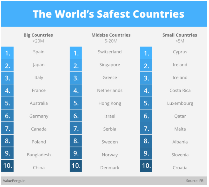 - Spain is beaten by Singapore by a whisker. It scores 43 for safety and has a population of just over 47 million.