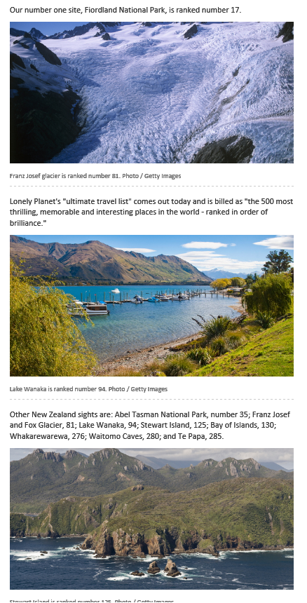 First, read this article in the NZ Herald, headed: World’s best places to visit: NZ scores 9 spots in Lonely Planet’s list.