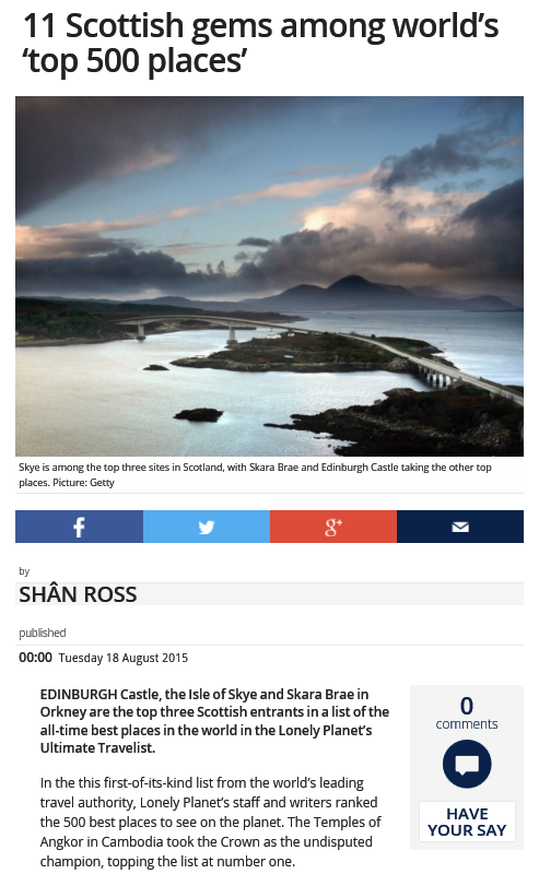 The Scotsman told its readers that there were 11 Scottish gems among world’s top 500 places, which for a country the size of Scotland, puts New Zealand’s paltry 9 into proportion. It says that England has 12 places listed, Wales has 7, Ireland gets 4 and there’s 2 in Northern Ireland.