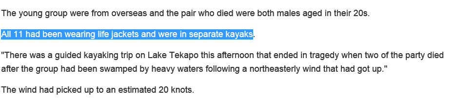 .Gaskin said the weather was calm when the group set out but the group was battered by 40 k/hr NW winds which swamped the boats, tipping the occupants into 3 degree Celsius water. He added that it wasn’t unheard of for weather conditions to change so quickly on Lake Tekapo, saying
