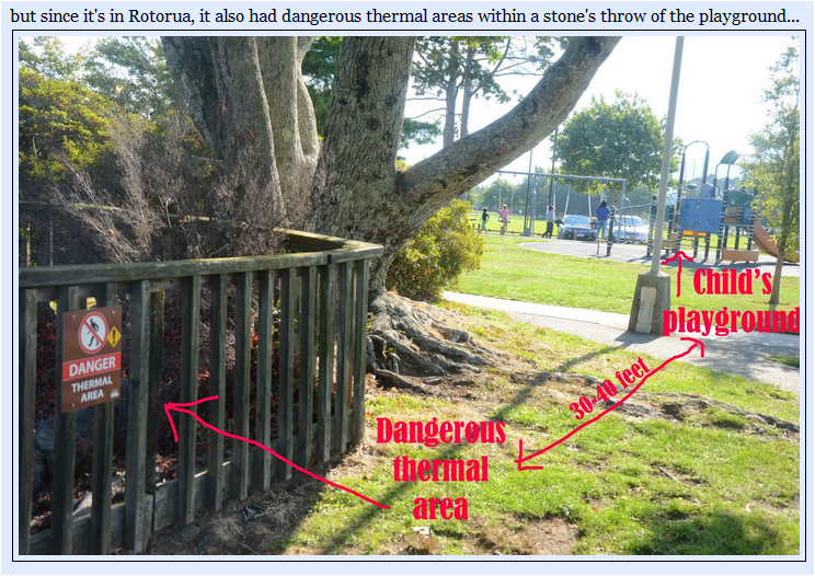 Our regular readers may recall that Kuirau Park is an open stretch of municipal parkland containing geothermal mud pools surrounded by low fencing. There have a been a number of deaths and scaldings in the park, which also has a children’s playground, raising questions about the adequacy of fences around the hot pools.
