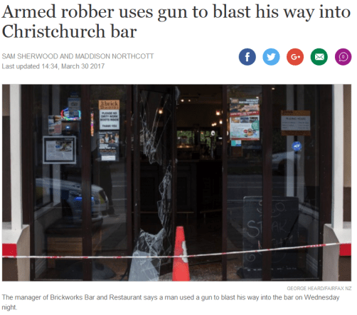 “Police are seeking a masked man who approached a woman in Christchurch this morning and pointed what is believed to be a firearm at her head. The man approached her from behind about 6am on Riccarton Ave, near the Cricket Oval and pavilions, and pressed something to her head. The woman screamed and pulled away, and the man ran off...he was wearing a baggy grey hoodie, dark trousers and a beige Halloween-type mask, and was carrying what appeared to be a small dark-coloured firearm.” source Weekend NZ Herald