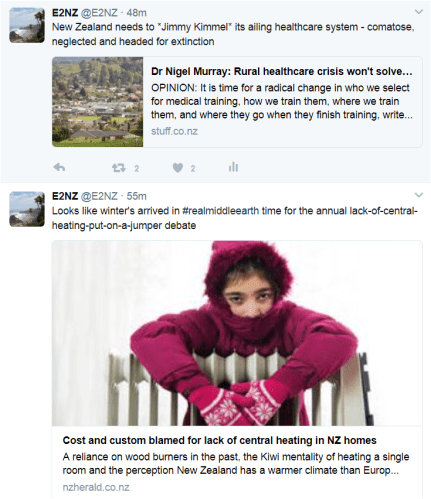 If you’re active on social media you may be interested to hear E2NZ.org has quite an international Twitter profile, with over 3,000 followers and a pretty good exposure rate.