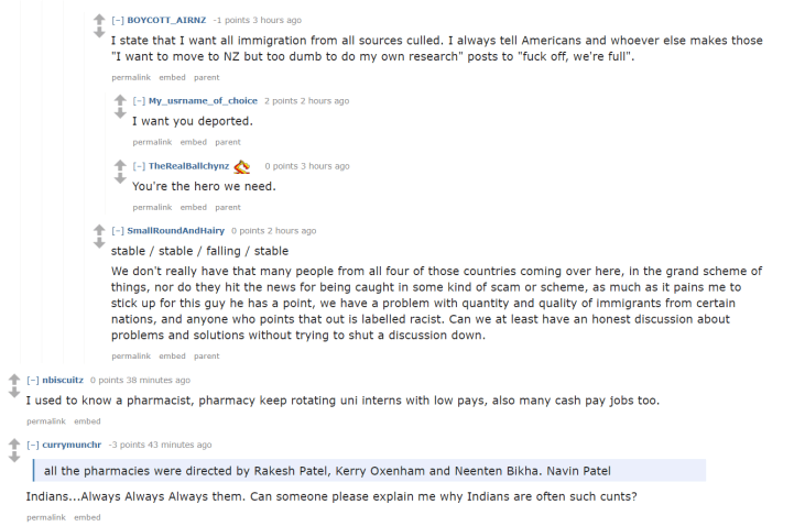 Here’s the screen shots of the reddit New Zealand thread (link is to a cached version) …be advised some of the language used, and the derogatory remarks about Indians and Chinese, are likely to offend most fair minded, rational people. Comments with the most likes are displayed first: