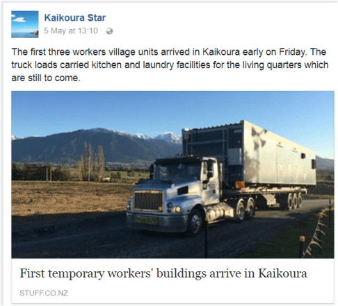 Seventy five, 4 bedroomed units are to be hauled over from Australia to form an allegedly temporary ‘village’ on the junction of Mt Fyffe and Ludstone Roads, metres from the local high school. More than 300 workers will live there while they “frantically” try to get the critical Kaikoura coastal route opened by the year end.