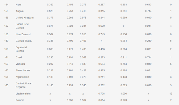 Consider, for example, the industrialised nations the UK and New Zealand, which this year both hold bottom-ten positions following very poor performances in domain 5, i.e. Child Rights Environment. The methodology for obtaining the final score in the Index is such that extremely poor performances in one domain cannot be compensated by higher scores in other areas, as all children’s rights are equally important. Extreme underperformance in one of the domains therefore creates an insurmountable bottleneck that automatically demotes the concerned country to the lower-most region of the Index… source