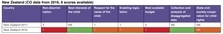 New Zealand’s record in the 2016 study showed six times the lowest score for non-discrimination, best interests of the child, respect for the views of the child, enabling legislation, budget, and data. Furthermore, the country has no maximum or average scores on record.