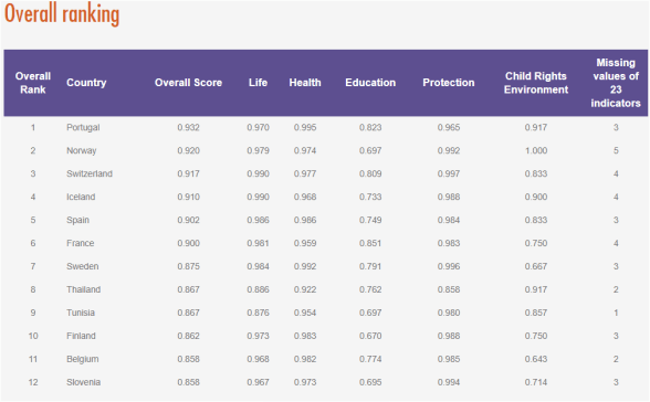 Portugal is placed top in the index due to its strong performances in the areas of child legislation, health and education.