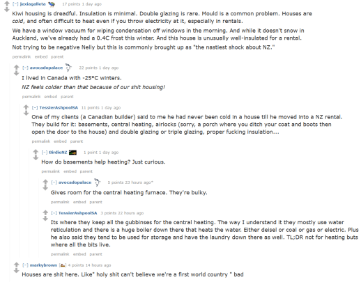 Note how the OP makes the mistake that most migrants do – she thinks that building their own home will resolve the problems with New Zealand’s appalling infrastructure, sadly she is unaware of the shoddy building standards, the substandard materials and under-skilled workforce. Then there’s the relative lack of culture, the anti-intellectualism, and distrust of migrants…