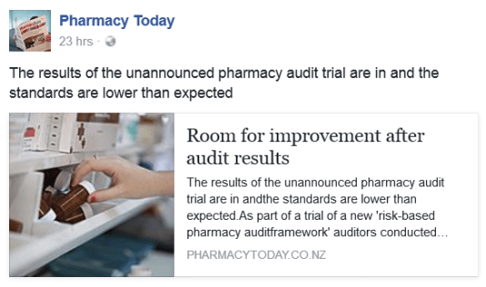 Pharmacy Today is reporting that during a trial of a new “risk-based audit framework,” surprise visits were made to 90 Auckland pharmacies over May and June. The audits preceded what is expected to be a national rollout of the new framework to other pharmacies across New Zealand.