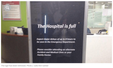 Middlemore Hospital full: Patients told ‘go elsewhere’ or wait at least eight hours: Under-pressure staff at Middlemore Hospital told accident and emergency patients to go elsewhere last night or face a wait of up to eight hours. They made a sign at put it up at the front of the Accident and Emergency Department warning people off because of extensive delays. “The Hospital is full,” it stated. “Expect major delays of up to 8 hours to be seen in the Emergency department…”